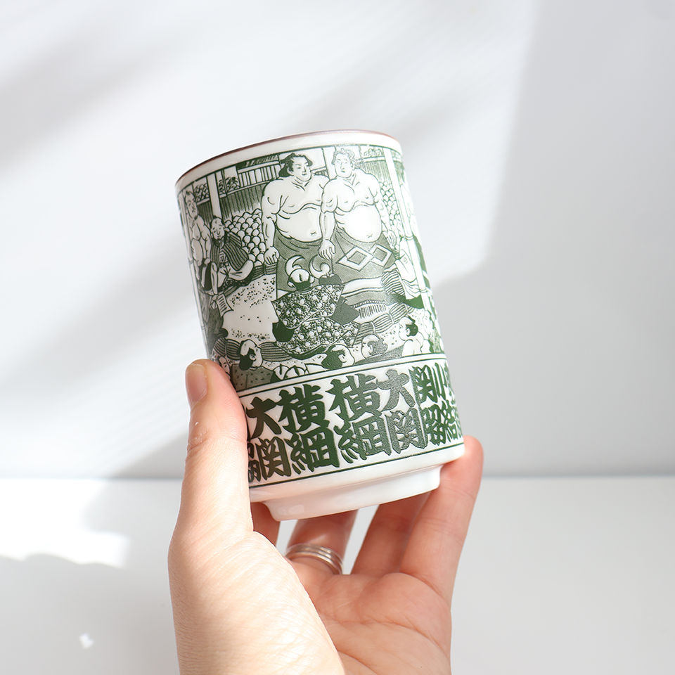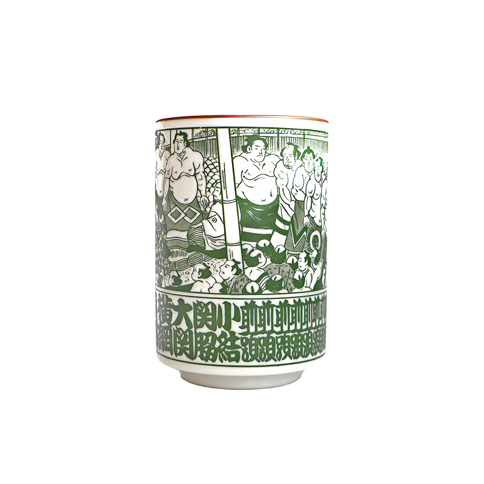 相撲柄が楽しい、お土産にも喜ばれるたいへん人気の湯呑みです。